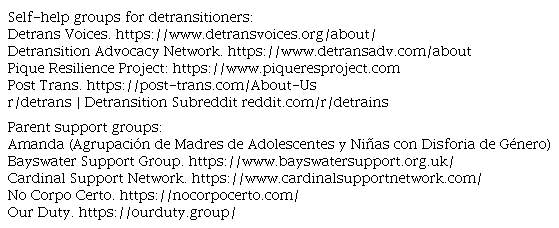 After the enthusiastic support for the transition, the abandonment of people who repent and want to de-transition leads them to form self-help groups, an initiative that is also undertaken by groups of parents. Table 6 lists some of these self-help groups. Beyond these aids, "clinical guidelines" are required for detransitioning according to its typology if it is motivated by the cessation of transgender identity or for other reasons (Boyd et al, 2022; Expósito-Campos, 2021).