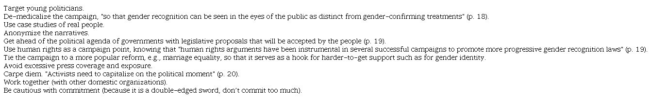The strategies of transgender activism are described in the paper uncovered by James Kirkup (Kirkup, 2019; 2021) that was produced by the law firm Dentons, the Thomson Reuters Foundation, and the International Lesbian, Gay, Bisexual, Transgender, Queer, and Intersex Youth and Student Organization (IGLYO) entitled "Only Adults? Good practices in legal gender recognition for young people" (Dentons, Thomson Reuters, & IGLYO, 2019). Table 7 lists lobbying tactics to change laws so that self-determination of gender identity with no age minimum prevails over what parents and professionals say (Dentons et al, 2019, p. 15).