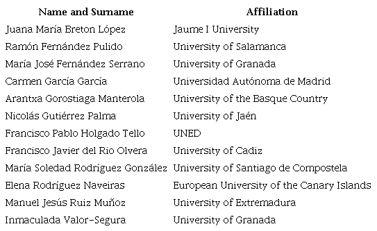 In order to carry out the evaluations of the different selected tests, 12 university professors were contacted to act as reviewers. The selection of these reviewers was carried out aiming to ensure gender equity, that the greatest number of Spanish universities were represented, and that the persons selected were experts in the construct evaluated or in psychometrics, and that there was no conflict of interest of any kind. Each test was evaluated by two reviewers, one an expert in the substantive subject and the other in psychometrics. Table 1 lists the reviewers who collaborated in the evaluation.
