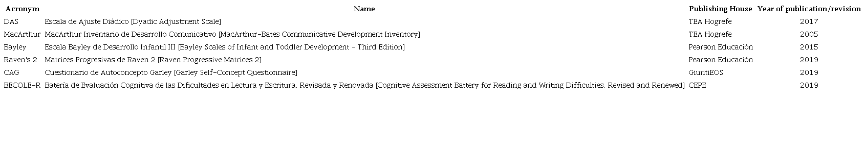 The different publishing houses (TEA-Hogrefe, Pearson Educación, GiuntiEOS, and CEPE) together with the National Test Commission decided on the different tests to be reviewed. In this ninth edition, 6 questionnaires were evaluated (see Table 2).