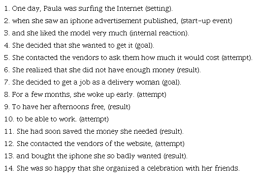According to the causal chain model, the construction of narrative coherence involves constructing a causal chain of events (Black & Bower, 1980; Omanson, 1982). Events that have a cause or consequence are part of this chain. Those that do not, represent dead ends. Figure 1 presents the causal chain representation of the story in Table 1.