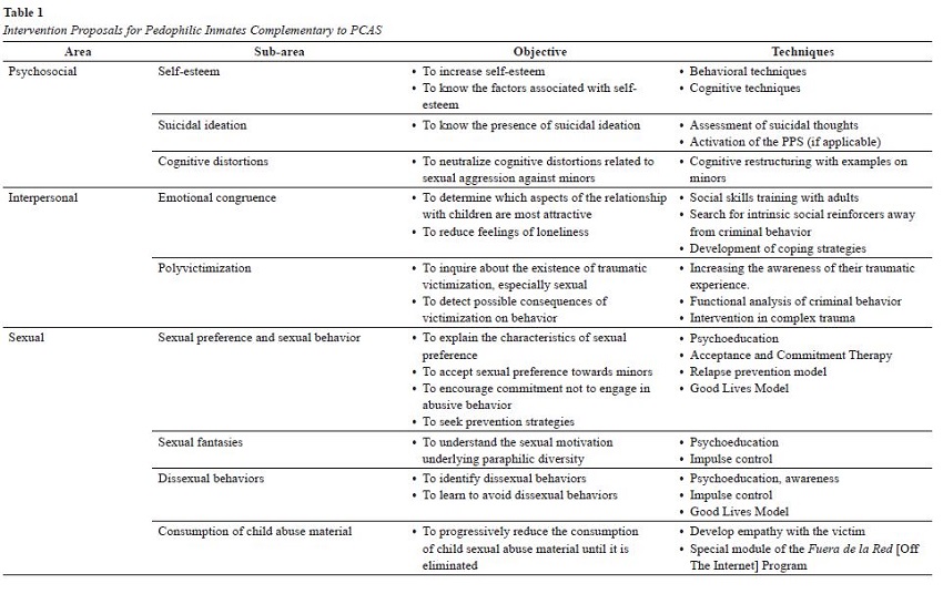In the interpersonal area, it is proposed to determine which aspects of the relationship with minors are more attractive and to reduce feelings of loneliness as a consequence of the sexual interest, a risk factor for recidivism (Herrero, 2013). In the case presented, the participant reported being a "lonely person" and having no social support, so it could be beneficial, as we proposed in Table 1, to develop social skills with adults, search for meaningful activities, and establish emotional coping strategies.