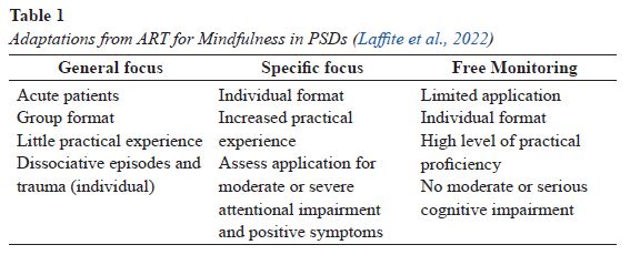 The second type of practice to be distinguished is free monitoring, which consists of noticing and being aware of any internal or external experience that appears (radical openness) without reacting, letting it flow, without establishing a specific focus. Free monitoring presents in our opinion the following difficulties for its application in psychosis: 1) recognizing and continuously reevaluating the different changing sensory experiences requires a significant attentional demand, which may not be adequate for people with moderate or severe levels of cognitive impairment, 2) hallucinations are very powerful experiences that tend to impose themselves by exerting a magnet effect, 3) some psychoses, such as schizophrenia, involve a significant alteration of ipseity (Sass & Parnas, 2003; García Montes & Pérez Álvarez, 2003), this means that experiences such as what is known as "dual consciousness", involving the distinction between the observing self and the experiencing self, can be widely confusing. For a summary of the different adaptations see Table 1.