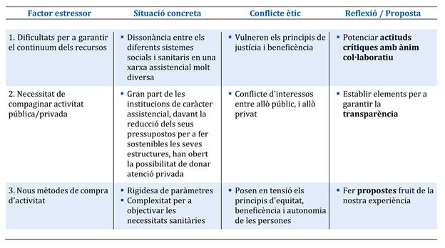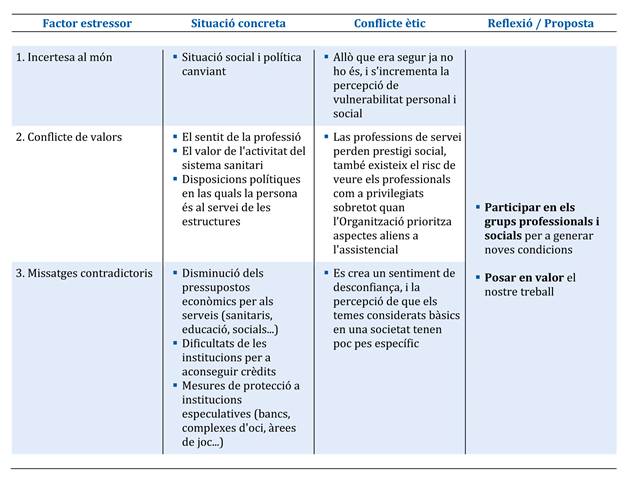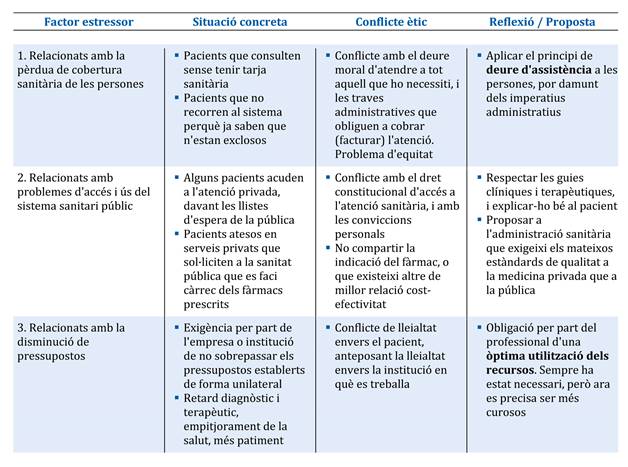 Medical practices and patient's care activities may be associated with conflicts of different nature, such as personal, professional, or ethical. These conflicts, furthermore, may have even increased due to the arrival of austerity policies devised to deal with the effects of the global economic crisis. With the purpose of detecting, defining and proposing solutions to some of these conflicts, CèAVOC encouraged a debate, which afterwards resulted in exploring its staffs' work environment, in examining their daily realities as well as the ethical principles that affected them. Multiple ethical stressor factors were identified, one of which reflected higher awareness of their personal and social vulnerability. It seems necessary that health professionals are deeper involved in the management of health by adopting a patient service approach.