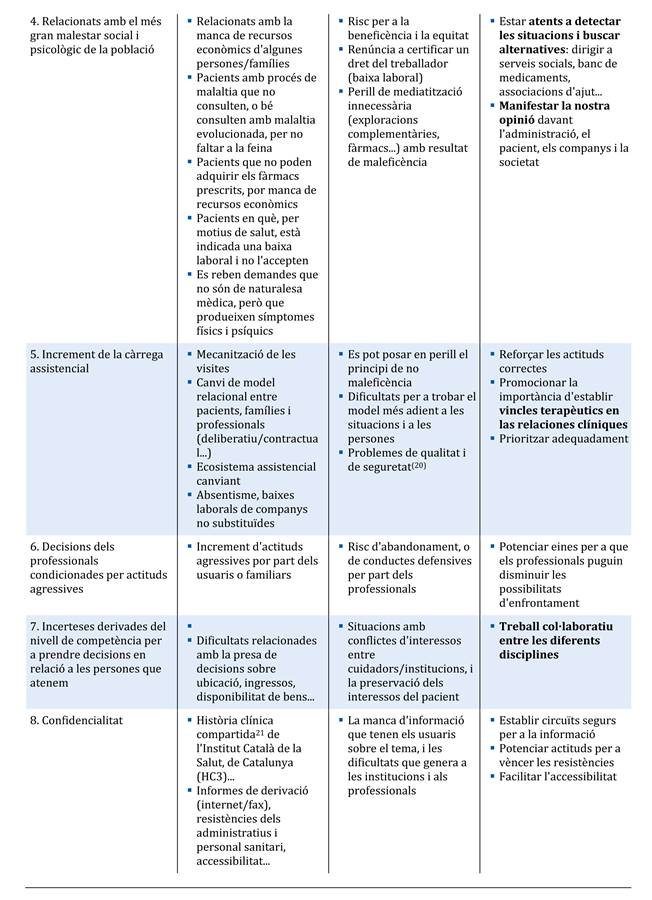 Si bé els professionals de la salut mostren preocupació, actitud crítica, i escepticisme davant la situació actual global, són els factors de més proximitat els que generen més conflictes ètics, per ser els que més directament incideixen sobre l'activitat laboral i la vida diària tant de professionals com de pacients. Els factors derivats d'aspectes socials, polítics, institucionals... es viuen com a quelcom llunyà, d'elevada complexitat, quelcom sobre el que s'ha d'opinar i proposar, però que s'escapa del control individual i corporatiu.