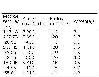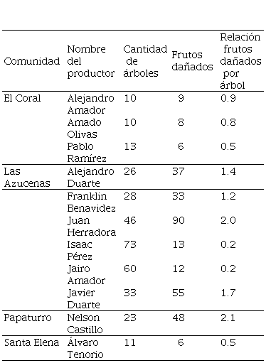 Debido a la dinámica de la cosecha de los frutos de cacao y a las fechas en la que se realizó el estudio, no fue posible colectar datos para determinar un porcentaje de daño con precisión. Para generar una idea del daño, se les consultó a los productores y se establecieron parcelas de 20 m x 50 m en 11 áreas de cacao. Dentro de ellas se contaron todos los frutos mordidos, tanto los recientemente mordidos (una semana antes del conteo), como aquellos que yacían en el suelo o en los árboles y que habían sido mordido hasta 22 días antes del conteo.