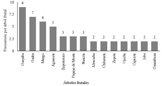 Los productores hicieron mención de un total de 32 especies de árboles que producen frutos atractivos para la fauna silvestre y que se pueden utilizar como señuelo para redirigir su atención de los frugívoros, entre ellas, las mencionadas con mayor frecuencia fueron: Guayaba (Psidium guajava), guaba (Inga sp), mango (Mangifera indica) y aguacate (Persea americana); seguidas de zapotemico (Pouteria campechiana), papaya de monte (Carica papaya) y nancite (Byrsonima crassifolia); además de almendra (Terminalia catappa), chilamate (Ficus sp), zapote (Manilkara zapota), ojoche (Brosimum alicastrum), capirote (Miconia sp), jobo (Spondias mombin) y guanábana (Annona muricata) (Figura 2).