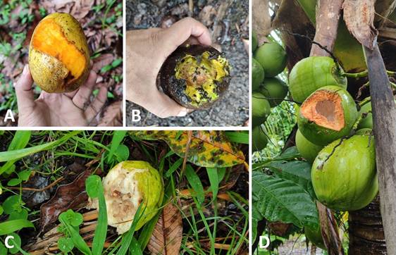 Varias especies fueron mencionada solamente una vez, entre ellas: Coco (Cocos nucifera), pijibay (Bactris gasipaes), mamón chino (Nephelium lappaceum), guineo yute (Musa sp), higuerón (desconocido), guabillo (Inga sp), helequeme (Erythrina sp), pitahaya (Hylocereus undatus), guaba paterna (Inga sp), guaba caite (Inga sp), chaperno (Lonchocarpus sp), espabel (Anacardium excelsum), corozo (desconocido), palma africana (Elaeis guineensis), granadilla montera (Passiflora sp), cacao montero (Theobroma sp), palo de hule (Castilla elastica) y palmita (desconocido). Algunos productores, resaltaron especies de árboles frutales específicamente para algunas especies de fauna silvestre que se alimenta del cacao, por ejemplo, fue mencionado con frecuencia para ardilla: guayaba, aguacate y mango; para pájaro carpintero: papaya montera; para mono: Guaba, zapotemico, almendra (Terminalia catappa), mango, chilamate, papaya montera, capirote y chaperno (los nuevos brotes [hojas tiernas]). En las observaciones de campo, fueron encontrados frutos de algunas especies de plantas, mordidos por ardillas (Figura 3).