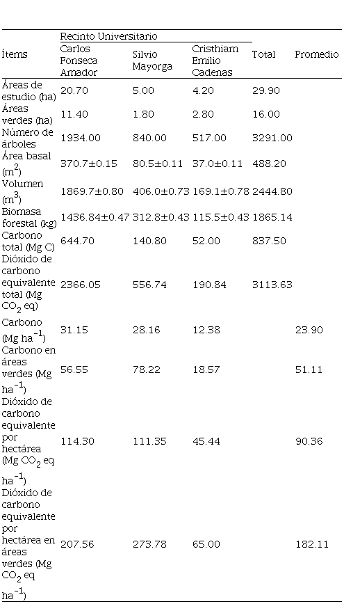 Los tres recintos capturaron 3 113.63 Mg CO₂ eq (mega gramos de dióxido de carbono equivalente), siendo el recinto Carlos Fonseca Amador el de mayor captura, lo que está relacionado con una mayor área, densidad de árboles y madurez de los árboles, aportando a la reducción de gases de efecto invernadero. En promedio en los tres recintos se capturó 90.36 Mg CO2 eq ha-1, y es el recinto Carlos Fonseca Amador, el que más CO2 equivalente captura por hectárea (114.3); estos valores son inferiores a los reportados por Aguirre Padilla (2017) en un bosque seco, en el que registraron valores de 118.44 Mg CO2 eq ha-1. Sin embargo, el recinto Silvio Mayorga es el que registra mayor dióxido de carbono equivalente por hectárea en áreas verdes (Mg CO2 eq ha-1).