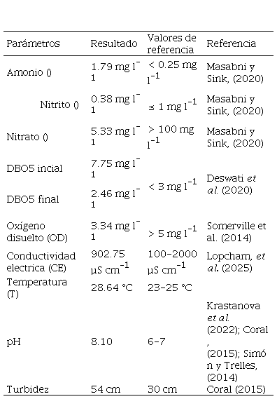 La conductividad eléctrica varía según Lopcham et al. (2025) entre 100 – 2 000 µS cm-1. El valor registrado (Cuadro 1) se mantiene dentro del rango de aceptación, sin embargo, este parámetro puede ser afectado por los iones disueltos en el agua que provienen de la alimentación de los peces o de la formación de iones nitrogenados; no obstante, la conductividad no especifica información sobre concentraciones de nutrientes individuales, pero es un indicador de la cantidad de nutrientes, además de relacionarse con otros parámetros como el pH y las concentraciones de nitrato, nitrito y amonio. Si el pH es alcalino en el sistema, significa que aumentó la concentración de estos iones.