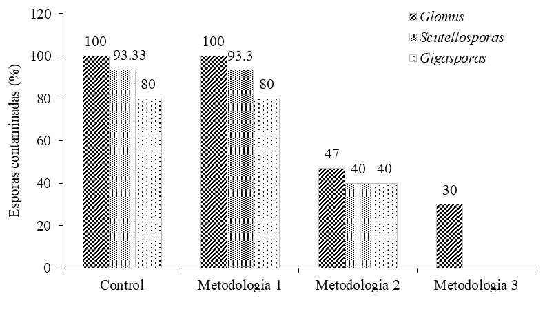 La efectividad de las metodologías de desinfección varió significativamente según el género de HFMA (Figura 2). Debido a la limitación en el número de esporas viables de los géneros Gigaspora spp y Scutellospora spp, la efectividad de la metodología 3 se evaluó exclusivamente en Glomus spp. Los resultados indican que el género Glomus spp fue el más resistente a la desinfección, con una contaminación inicial de 100 % con la metodología 1, que se redujo al 30 % con la metodología 3. Los géneros Gigaspora spp y Scutellospora spp respondieron mejor a las metodologías de desinfacción; Gigaspora spp redujo la contaminación en 50 % con la metodología 2 respecto a la metodología 1 (de 80 % a 40 %), mientras que Scutellospora spp reduce la contaminación en un 42.8 % con la metodología 2 respecto a la metodología 1.