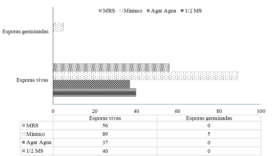 El éxito en la germinación de las esporas está en dependencia del proceso de desinfección. La germinación se evaluó en cuatro medios de cultivo con el fin de comprobar la capacidad de germinación de las esporas de HFMA, los medios de cultivos utilizados son los propuestos por Murashige y Skoog (1962) al 50 %; Man, Rogosa y Sharpe (MRS) y el medio mínimo (M) y como control (testigo), el medio Agar Agua.