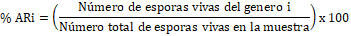 Abundancia relativa de géneros de HFMA (%). Se determinó para establecer el perfil taxonómico predominante de la comunidad nativa en los lotes (variedades). Esta variable se calculó como el porcentaje de esporas vivas identificadas para cada género (Glomus, Gigaspora, Scutellospora) con respecto al número total de esporas vivas cuantificadas en la muestra de suelo. La identificación a nivel de género se realizó utilizando las claves morfológicas de la International Culture Collection of (Vesicular) Arbuscular Mycorrhizal Fungi (INVAM, 2024). El cálculo de la abundancia relativa (% AR) para cada género (i) se realizó según la metodología de cuantificación y caracterización taxonómica propuesta por Schenck y Pérez (1987), utilizando la siguiente fórmula: