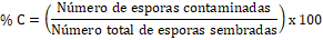 El porcentaje de contaminación de las esporas de HFMA se registró para evaluar la efectividad de las diferentes metodologías de desinfección. La evaluación se realizó a los siete días después de la siembra en los medios de cultivo estériles contenidos en las placas de Petri e incubados a 25 °C. Se tomó en cuenta la presencia y desarrollo de contaminantes fúngicos (hongos y levaduras) y bacterianos, cuya fuente se asumió como originada directamente de la superficie de las esporas de micorrizas establecidas. El porcentaje de contaminación (% C) para cada metodología se calculó utilizando la siguiente fórmula: