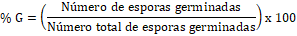 La viabilidad de las esporas de HFMA se evaluó registrando el porcentaje de germinación en el medio de cultivo in vitro. La evaluación se realizó a los siete días después de la siembra en las placas de Petri, monitoreando visualmente la emergencia del tubo germinativo de las esporas. El porcentaje de germinación (% G) se determinó mediante el conteo de las esporas germinadas con respecto al número total de esporas viables sembradas, siguiendo la metodología base establecida por Gerdemann y Nicolson (1963). La fórmula utilizada fue: