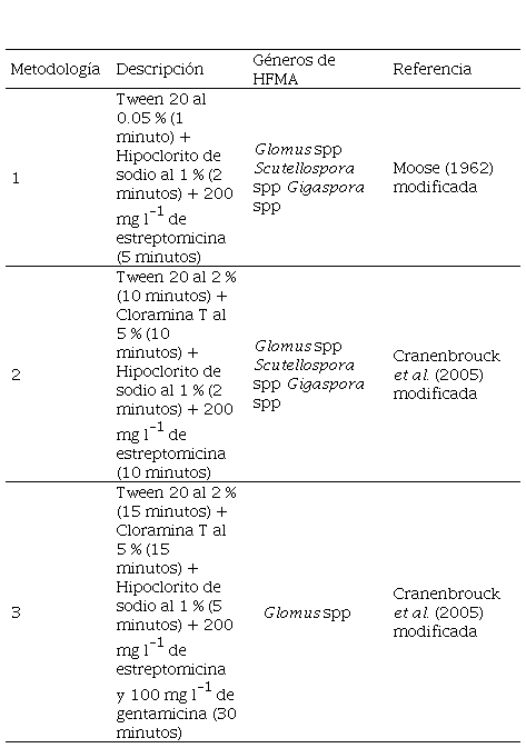 Las esporas de hongos formadores de micorrizas arbusculares (HFMA) nativas de suelo se extrajeron a través del método de tamizado y decantación propuesto por Gerderman y Nicolson (1963); y el método de centrifugación en sacarosa modificado por Brundrett et al. (1996). La extracción consistió en pesar 10 g de suelo adicionándose 100 ml de agua destilada mientras la muestra era agitada manualmente. Después de 30 segundos de sedimentación, el sobrenadante se filtró secuencialmente a través de tamices de 500, 250 y 25 micras y se recolectó en tubos Falcón de 50 ml. La muestra colectada en el tubo se centrifugó a 3 400 rpm durante cinco minutos, se eliminó el sobrenadante y se agregó 15 ml de sacarosa al 70 % (p/v). Luego se centrifugó a 3 400 rpm por cinco minutos, el sobrenadante se pasó por el tamiz de 25 micras y se enjuagó con abundante agua, al final la muestra (esporas con agua) se colectó en una placa de Petri para su visualización en el estereoscopio.