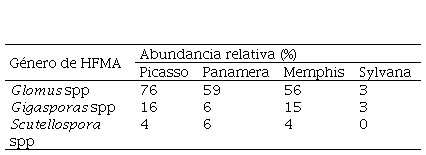 La mayor densidad poblacional de esporas vivas en el suelo cultivado con la variedad Panamera es un resultado clave que se interpreta como una respuesta específica del hospedero, que favorece la esporulación de los HFMA nativos y que está estrechamente ligada a la composición y cantidad de exudados radiculares liberados por la planta hospedera (Tian et al., 2021; Upadhyay et al., 2022). Se ha documentado que la variación genética entre cultivares influye directamente en los metabolitos secundarios y las señales químicas exudadas por la raíz (Zhao et al., 2020). Es posible que la variedad Panamera libere un perfil de exudados (como flavonoides o ácidos orgánicos específicos) que estimula la esporogénesis (formación de esporas) de las cepas presentes, particularmente las del género Glomus spp, el cual fue el más abundante en el estudio. Esta especificidad en la señalización química puede ser el factor determinante detrás del incremento de inóculo viable en este lote.