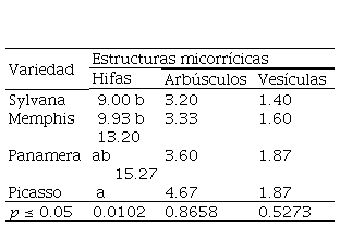La cuantificación de hifas fue significativamente diferente en las raíces de la variedad Picasso con respecto a las variedades Memphis y Silvana (Cuadro 3). No se registraron diferencias significativas en la cuantificación de las estructuras clave de intercambio y almacenamiento (arbúsculos y vesículas) entre las variedades. A pesar de esto, las estructuras tipo arbúsculos se presentaron en un número mayor que las vesículas en todas las muestras, lo que representa un buen estado funcional de la asociación micorrízica.