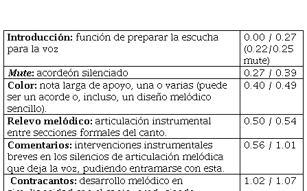 Es notable la importancia cultural del chamamé en su aspecto popular y masivo, siendo esta una música predominantemente instrumental. El desarrollo del chamamé canción reubica texturalmente a los acordeones en un lugar de protagonismo secundario, dada la centralidad o liderazgo de la voz, a la que no conviene musicalmente opacar. Veremos estos diferentes roles acompañantes a lo largo del arreglo de «El último cachapé»,[7] donde se pueden apreciar, también, relevantes elementos texturales.