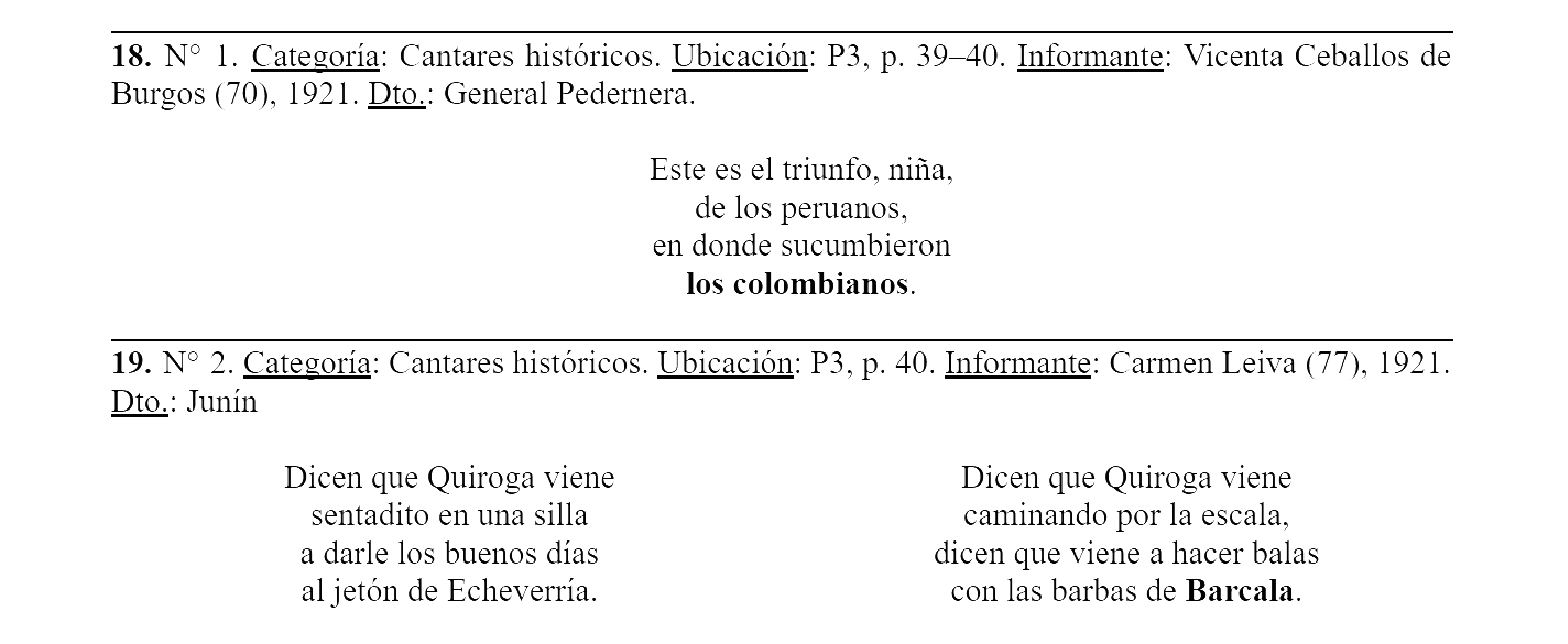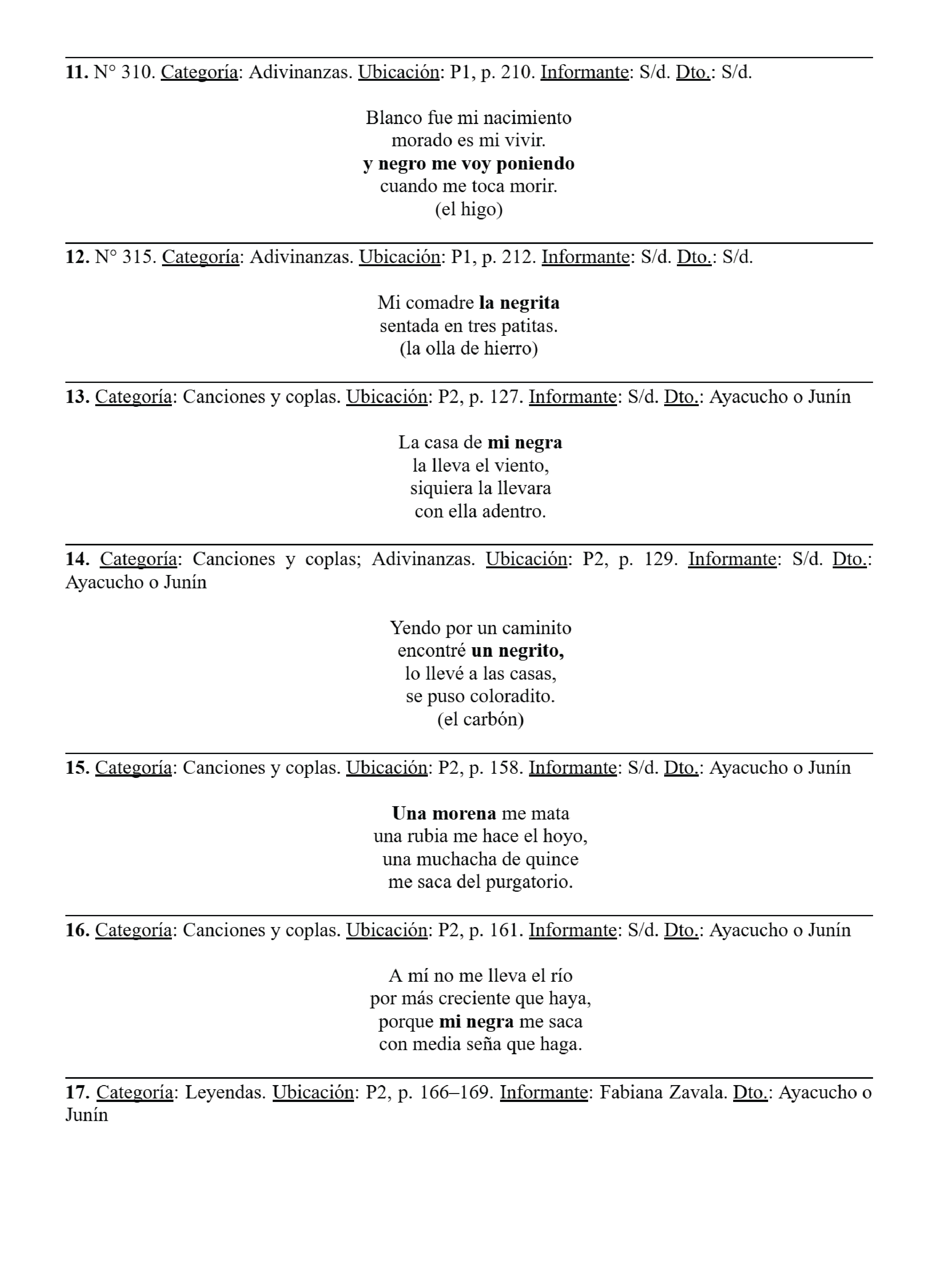Si bien este trabajo se centra en la selección del cancionero de Ochoa de Masramón, ante la vacancia de conocimiento vinculado a lo afropuntano, incluimos dos publicaciones que hizo en vida cuyo contenido fue parte del cancionero inédito.[2] Así, tenemos: P1: Selección del Cancionero tradicional de San Luis (1999); P2: Folklore del Valle de Concarán (1966); y P3: Cantares históricos de la tradición puntana (1970). La transcripción es literal, según su orden de aparición y para mejor entendimiento damos el título del capítulo. La numeración primera en negrita es nuestra, la cual empleamos en el análisis; las otras numeraciones en P1 y P2 son de Schärer, Zavala Rodríguez y Ochoa de Masramón, respectivamente. Para su mejor lectura marcamos en negrita la parte de interés.