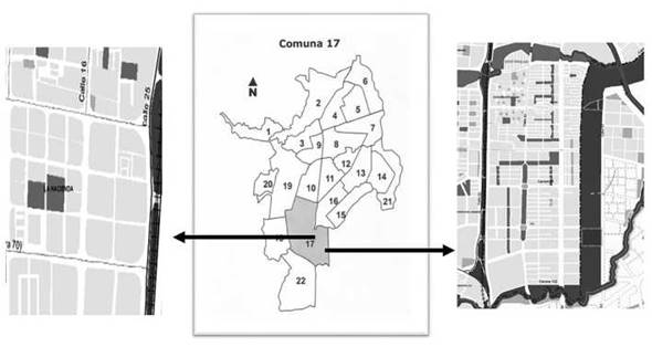 Figura 1. Mapa de la ciudad de Cali y de los barrios La Hacienda y Valle del Lili