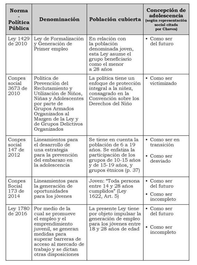 Fuente: elaboración propia.Puede valorarse que algunas de estas normas relacionadas con la adolescencia han sido diseñadas en forma general desde la mirada adultocentrista, no contextualizada, y enfocadas en las “necesidades” que se consideran pertinentes de acuerdo a la representación social que se tenga de estos sujetos, como lo afirma Chaves. Lo anterior puede implicar que conforme se han subjetivado los adolescentes (como desviados, peligrosos, incompletos, etc.), así mismo se han creado políticas públicas para atender estas “necesidades”, como para controlar un riesgo que emerge en la sociedad.