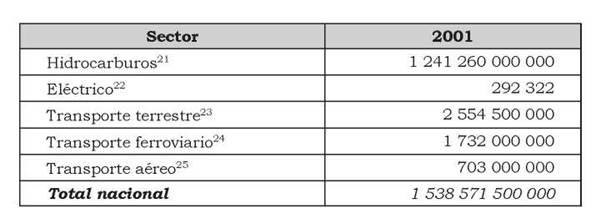 Como en las otras racionalidades bélicas analizadas, esta también funciona de acuerdo con un particular procedimiento de veridicción que ya no es de tipo jurídico, para efectuar medidas de excepción que garanticen la soberanía; ni tampoco de tipo mediático, para gestionar el consentimiento social de la guerra; sino de tipo económico, que produce garantías de inversión y evalúa los costos económicos del terrorismo. En la tabla 1 puede verse el balance de los costos que en el 2001 fueron causados por los ataques sistemáticos a la infraestructura energética, vial y de comunicaciones.