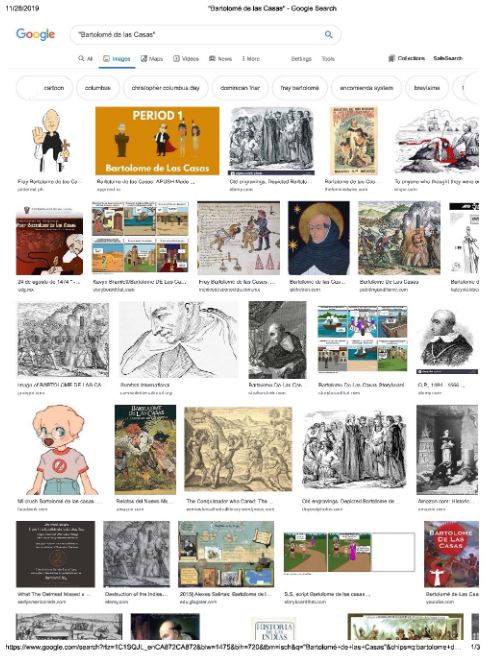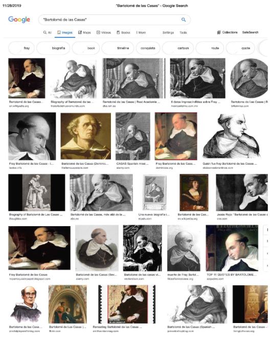 The use of visual material produced in other eras, and the financial incentive to avoid paying copyright and royalty fees, also means that platforms where we consume visual material can be rife with ethical and values-related problems that do not necessarily reflect cultural and social norms of today’s world. Yet, these illustrations are being used to characterize information for today’s readerships (Kratz, 2011, pp. 21-48). Of the 122 stock images relating to Las Casas at Alamy, only 23 are not reproductions of engravings, statues, and books that are out of copyright. 17 of those illustrations depict Native Americans expressing thanks and appreciation for Las Casas’s interventions on their behalf, and 28 of them reproduce or imitate a famous portrait of Las Casas. Another commercial image site, Getty Images, offers a portrait of Las Casas in its search results for his name; and while citing the source of its portrait of Las Casas as coming from the 1791 illustrated book, Retratos de los españoles ilustres, it nonetheless offers the image for up to $575 Canadian Dollars without any compelling reason for why it should earn this revenue when a high-quality digitized copy of the image can be easily found online for free (Getty Images, 2019).