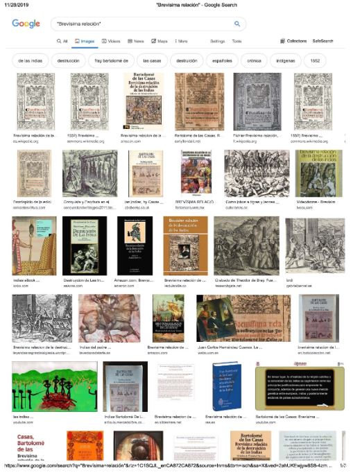 Two metadata sets, which will also comprise search queries, will help us to reach an understanding of the visual culture associated with Las Casas and the reception of his most famous work: “Bartolomé de las Casas” (Fig. 2) and “Brevísima relación” (Fig. 3). Remarkably, the web search results for both queries when entered into English- or Spanish-language search engines point first to English-language resources such as Wikipedia, which demonstrates the popularity of this corpus among Anglophone audiences and foreshadows the shaping of Lascasian visual culture, as well as its metadata, by non-Hispanophone audiences. The Google Image results, however, emphasise Spanish-language webpages so that if one searched for textual results, information is first presented in English, whereas the visual results offer information first in Spanish. These different language preferences highlight another way that information online is shaped by metadata based on the language in which it was created.