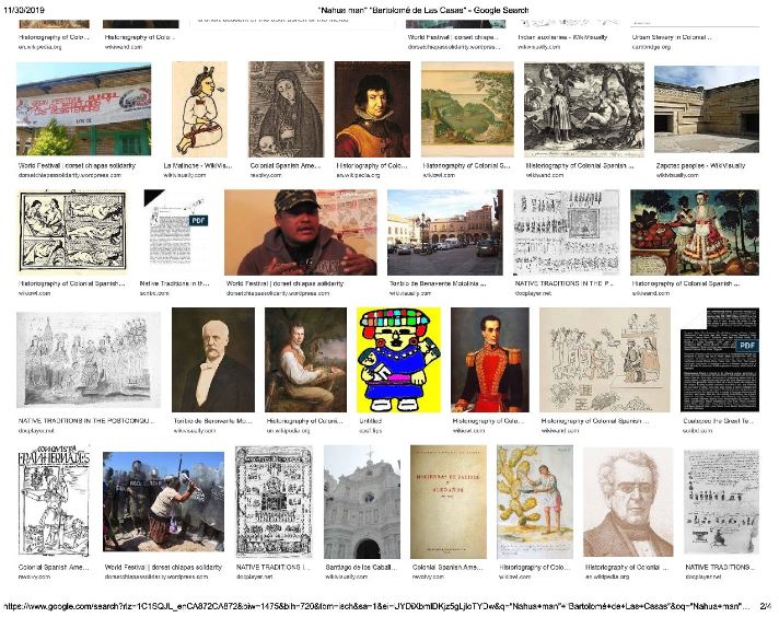Both Google Image search queries produce a contrasting range of sub-collections. Whereas “Brevísima relación” has been tagged with alternate terms frequently found in the book’s metadata (year of publication, other words frequently found in the book’s title in editions produced over the centuries, as well as the genre of book)—that comprises the information that a library would use to catalogue the work in Spanish—“Bartolomé de las Casas” attracts a more complex array of collection terms in both English and Spanish, and that would not be used to catalogue the book. “Cartoon”, “route”, “quote”, “citas [quotations]”, and “statue” are unrelated to the book’s metadata and their association with Las Casas requires further consideration, particularly the two terms that explicitly refer to visuality.