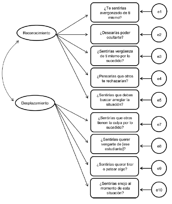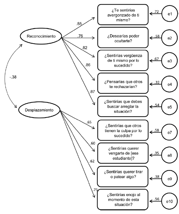 Se concluye que la adaptación del cuestionario MOSSSAST (1999) es empíricamente sustentable para medir el manejo de la vergüenza en adolescentes mexicanos. La obtención mediante el análisis factorial confirmatorio de un modelo de medición del constructo integrado por dos factores (Reconocimiento y Desplazamiento) negativamente correlacionados coincide con lo reportado por otros estudios acerca del instrumento (Ahmed, 1999; Ahmed & Braithwaite, 2006) y brinda apoyo a la existencia de una estructura factorial invariante en el cuestionario.