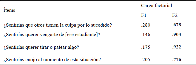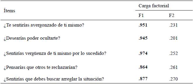 Como criterio de inclusión para los ítems se consideró que estos tuvieran una carga factorial de 0.30 o más, y que estos valores se observaran en sólo uno de los factores, lo cual refleja la solidez teórica del reactivo (Hair, Anderson, Tatham, & Black, 1999; Martínez et al., 2006). Se eliminó el reactivo ¿Serías incapaz de decidir si tú fueras culpable? ya que presentó altas cargas factoriales en dos factores, lo cual es indicio de escasa claridad conceptual del ítem o de dificultades en su comprensión (Cea, 2004).