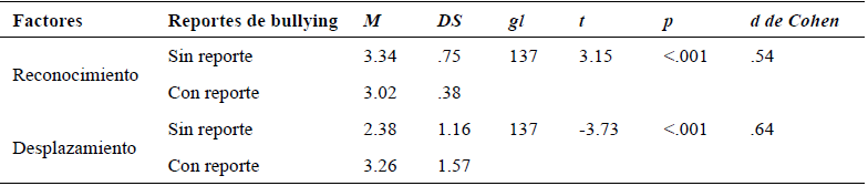 Se utilizó una prueba t de Student para muestras independientes con el fin de comparar los puntajes resultantes de los factores de Reconocimiento y Desplazamiento de la vergüenza entre ambos subgrupos. Se encontró que existían diferencias significativas en los puntajes de los grupos de estudiantes con y sin reportes de bullying en los dos factores evaluados. El análisis de las medias reveló que los puntajes fueron significativamente menores en reconocimiento y mayores en desplazamiento en el grupo que reportó bullying. El análisis del tamaño del efecto permite concluir que la diferencia detectada entre ambos subgrupos de estudiantes en los dos factores evaluados es de magnitud mediana (Cárdenas & Arancibia, 2014; véase tabla 4).