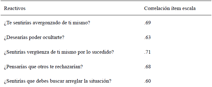 Mediante el Alfa de Cronbach se determinó la correlación de los ítems con los puntajes de la escala (véase tabla 1). La correlación de los reactivos fue superior a .30, por lo que se decidió incluirlos en el análisis (De Vellis, 2012).