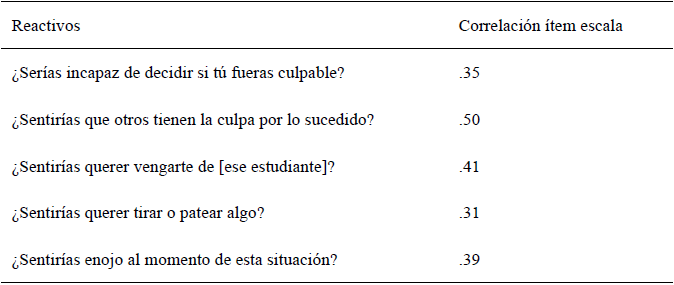 Como resultado del proceso de validación de contenido en la versión modificada se eliminaron tres de los escenarios originales propuestos por la autora, debido a la consistencia en las respuestas de los expertos con respecto a que eran poco representativos de la muestra de estudiantes con los que se realizaría el estudio. Por ejemplo, dentro de los escenarios eliminados se encontró el siguiente: Imagina que estás en la escuela y ves a un estudiante más joven y le quitas los dulces de las manos y el maestro ve lo que hiciste.