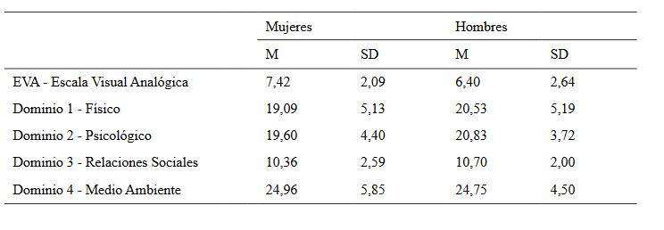 La Tabla 1 muestra las medias y la desviación típica en las áreas de percepción del dolor y calidad de vida según el género.
