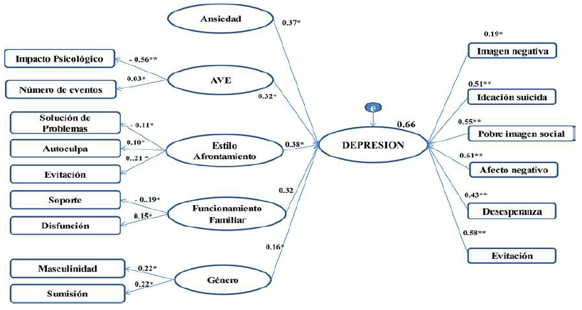 Una vez presentados los análisis descriptivos, se procedió a hacer el análisis de factores asociados. En la Figura 1 se presenta el modelo de medición y el modelo resultante de los factores asociados a la severidad de la depresión en los hombres, en el que variables como EVE (Peso Relativo de Varianza Explicado [PRVE] = 0.38) la ansiedad (PRVE=0.37), los estilos de afrontamiento (PRVE=0.38), el funcionamiento familiar (PRVE=0.32) y el género (PRVE=0.16) en interacción explican el 66% de varianza de la severidad de la depresión en hombres.