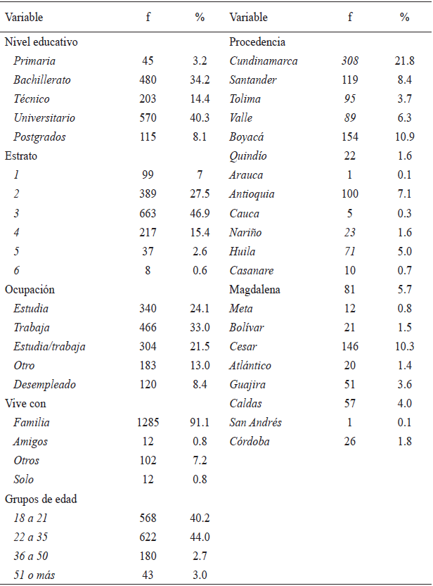 Las edades fueron de 18 a 83 años, con una media de edad de 26.59 años (DT = 9.45) principalmente jóvenes (40.2%, 22 a 35 años) y adolescentes mayores (40.2%, 18 a 21 años) que vivían principalmente acompañados de su familia (91.1%); con distintos niveles educativos, entre ellos universitario (40%), bachillerato (34.2%) y técnico (14.4%); de nivel socioeconómico principalmente medio bajo (estratos 2 y 3, con 27.5% y 46.9%, respectivamente) . Provenientes de aproximadamente 95 municipios ubicados en 22 departamentos localizados en las zonas de más densa población del territorio nacional (véase Tabla 1).