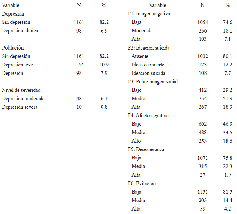 De los hombres encuestados, el 10.9% de la población presentaba síntomas de depresión en un nivel subclínico; el 6.9% alcanzó puntajes que sobrepasaron el punto de corte clínico (106 puntos); el 6.1% reportó un nivel de severidad moderado y el 0.8% de depresión severa durante el último mes. Analizando por dimensiones del CDH, en imagen negativa de sí mismo el 7.1% presentó un nivel alto, el 18.1% un nivel moderado y el 74.6% un nivel bajo. Asimismo el 7.7% de la población presentó ideación suicida, el 12.2% tenía ideas de muerte. El 18.9% refirió tener pobre imagen social alta y el 51.9% moderada; por otra parte, el 18.6% reportó tener afecto negativo alto y el 34.5% un nivel moderado. Para el caso del factor desesperanza, el 1.9% mostró alta desesperanza y el 22.7% moderada; finalmente el 14.4% presentó evitación moderada y el 4.2% alta (véase Tabla 2).