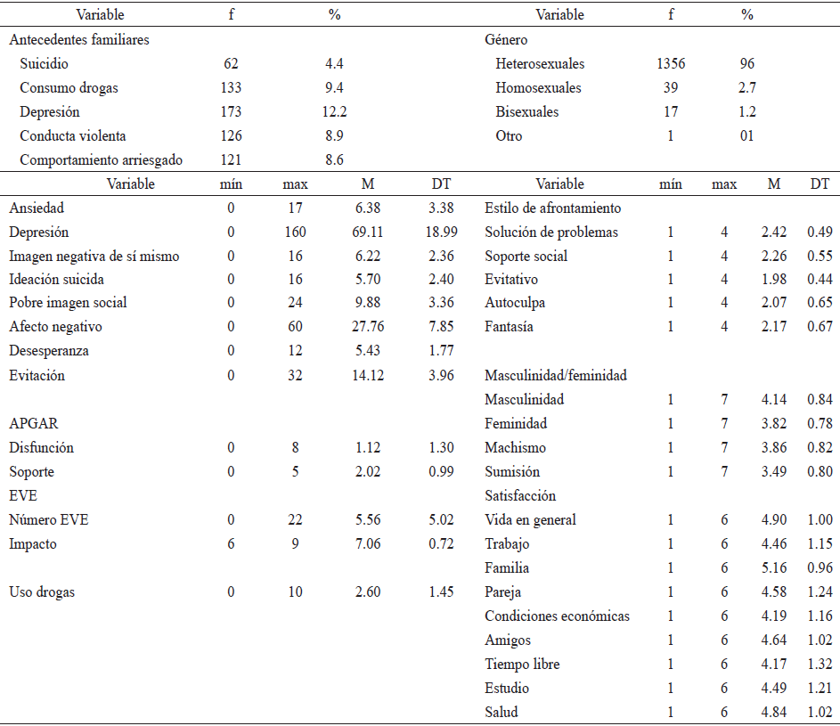 Del total de la población, el 12.2% tenía antecedentes familiares de depresión, el 9.9% de consumo de sustancias psicoactivas, el 4.4% de suicidio, el 8.9% de conducta violenta y el 8.6% de comportamiento arriesgado. Las medias reportadas de funcionamiento familiar (APGAR) tenían un promedio bajo de disfunción familiar (1.12) y un promedio moderado de bajo de soporte familiar percibido (2.02).