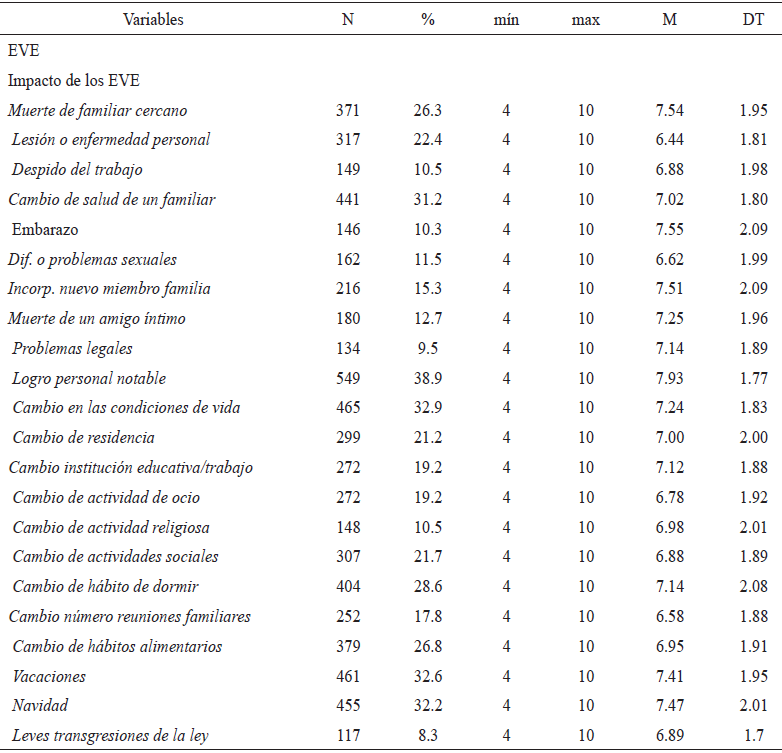En los EVE se encuentra que los cinco más frecuentemente reportados por los hombres fueron: logro personal notable (38.9%), cambio en las condiciones de vida (32.9%), vacaciones (32.6%), navidad (32.2%) y cambio en la salud de un familiar (31.2%); y los dos de menor frecuencia fueron problemas legales (9.5%) y leves trasgresiones de la ley (8.3%). Mientras que los cinco que produjeron más impacto psicológico en promedio fueron el logro personal notable (M=7.9), embarazo de la pareja (M=7.55), muerte de un familiar cercano (M=7.54), incorporación de un nuevo miembro a la familia (M=7.51) y navidad (M=7.47); y las dos de menor impacto fueron lesión o enfermedad personal (M=6.44) y cambio en el número de reuniones familiares (M=6.55) (véase Tabla 4).