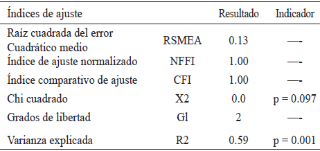 Al calcular los índices corregidos para el tamaño de la muestra (Véase Tabla 5), se encontró que todos denotan que el modelo tiene un nivel de ajuste adecuado, ya que aunque el RSMEA no es inferior a 0.10, el NFI sí es mayor a 0.80, el CFI es superior a 0.95 y el Χ2 como índice de bondad del ajuste no fue significativo ya que el p hallado era superior a 0.05, es decir, que el modelo está identificado porque sus parámetros lo están; y que es recursivo porque no tiene efectos circulares o recíprocos entre sus variables.