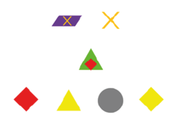 Transfer tests. They consisted of 36 trials distributed as follows: (a) intra-modal test, where relation criteria were form similarity, color similarity, and difference; (b) extra-modal test, where relation criteria were similarity in form, color, and size; and (c) extra-relational test, where the relation criterion was inclusion (see Figure 8). Stimulus arrangements were identical between the groups and were presented randomly. Participants were not informed whether their answers were correct or incorrect. The instructions presented in both groups were the following: