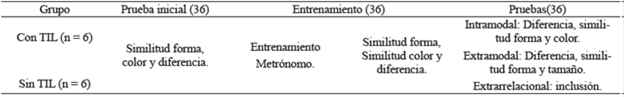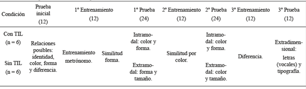 Initial test. Consisted of12 trials that evaluated relations of identity, color similarity, form similarity, and difference; they were presented randomly, without any feedback. The objective of this phase was to identify the participants' response tendency toward any of the relation criteria. No performance feedback was provided. The instructions presented in both groups were: