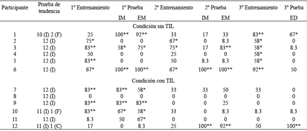 In the third training, a differential effect between conditions was observed. Participants in the no-LIT condition had scores above 50%, and two above 80% (P1 and P6), whereas in the LIT condition, none of the participants exceeded 50%, with the most common score being 0% (P8, P9, and P11). In Test 3 (extra-dimensional), performance was low in all participants, except for P12. Although this participant did not obtain scores above 50% in the training sessions, he did have a performance above 80% in Tests 2 and 3.