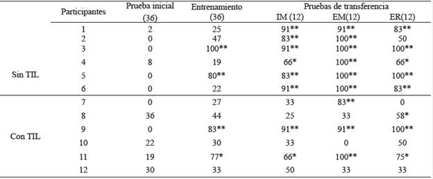 As already mentioned, according to some authors (Peña et al., 2012; Ribes, 2005; Serrano & Ribes, 2006), the different types of transfer tests used in this study involve different types of contact with the task or different qualities of behavioral adjustment. Specifically, it has been argued that the intra-modal and extra-modal tests can be answered based on a strictly perceptual contact with the task. According to this, there should be no relevant differences in these tests between participants with and without LIT, since what was limited was the linguistic contact, not the perceptual one; however, differences were observed and participants without LIT performed better. Based on the above, we can assert that the linguistic contact without interference was not a necessary condition for intra-modal and extra-modal transfer, given that two participants with LIT had high performances, but it was a facilitator of this transfer. As Delgado and Hayes (2013) and Pérez-Almonacid (2012) point out, although it is not yet clear what is the role of verbalizations or verbal mediations is in learning transfer tasks, interfering with them in training does not prove to be a condition that impedes transfer per se, as some theorists have previously affirmed (Barnes-Holmes, Rodríguez & Whelan, 2005).
