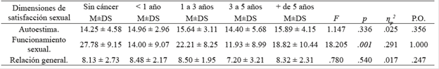 When we analyzed the relationship between fatigue and satisfaction with sexuality, ANOVA showed a multi-variate effect (F (3180) = 5,764; p = .001; (Wilks λ = .912), with a moderate effect (ηp2= .088). Statistically significant results were found in sexual functioning (p = .002) with a moderate effect (ƞp2 = .051), with an observed power (OP) = .877, and those who showed fatigue had lower satisfaction values (18.89 ± 9.86) than individuals who did not experience fatigue from the treatments performed (24.15 ± 10.79). For the self-esteem and general relation subscales, no statistically significant data were also found.