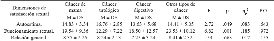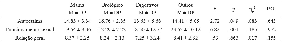 Univariate analysis demonstrated statistically significant differences in self-esteem, with a moderate effect, and sexual functioning, with a strong effect. Individuals with urological cancer had higher values of self-esteem (16.76 ± 2.85), followed by breast cancer (14.83 ± 3.34) and other types of cancer (14.41 ± 5.05). Digestive cancer was the one with the lowest values (13.63 ± 5.68).