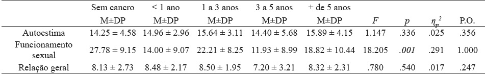 Univariate analysis demonstrated statistically signifi cant differences in sexual functioning. Individuals with no history of cancer disease had higher levels of satisfaction compared to individuals with a history of cancer disease. Comparisons within the group of individuals with cancer showed that those diagnosed less than one year and 3 to 5 years ago presented less satisfactory values in the sexual functioning dimension. Comparisons at the level of sexual functioning demonstrated differences with a strong statistical effect (.291). The individuals diagnosed in the period bet ween 1 and 3 years ago were those with the highest values and the group diagnosed 3 to 5 years ago was the lowest.