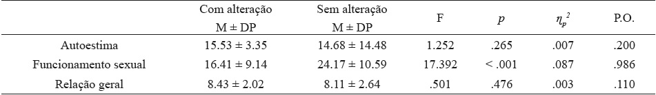 Statistically significant results were also found in sexual functioning (p = .001) with a strong effect (ηp2= .155), with an observed Power (OP) = .999. Those who had surgical treatment had significantly lower sexual functioning on ave rage, with values of (17.75 ± 9.74) compared to individuals who did not undergo surgical treatments (26.27 ± 10.05).